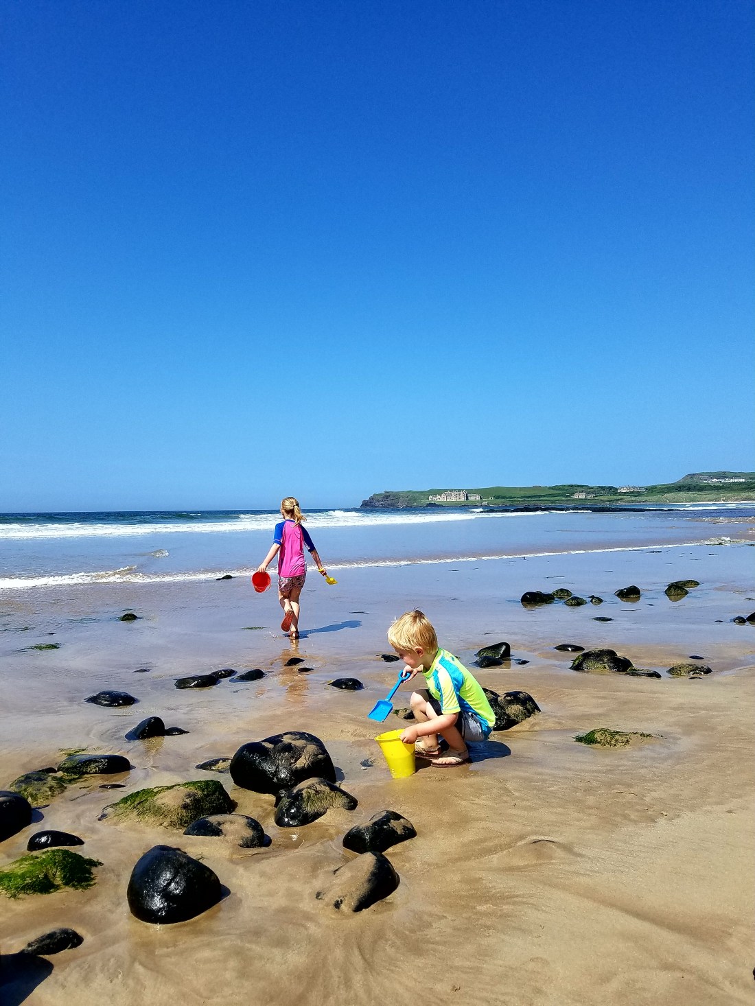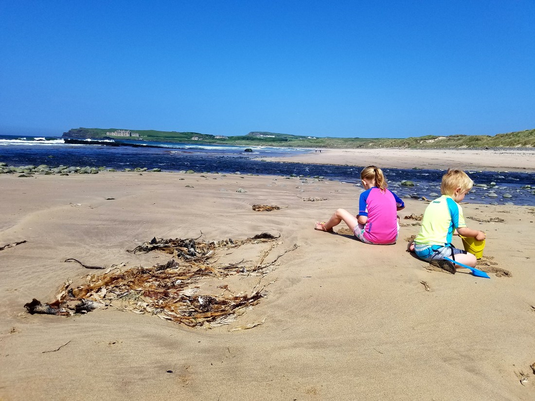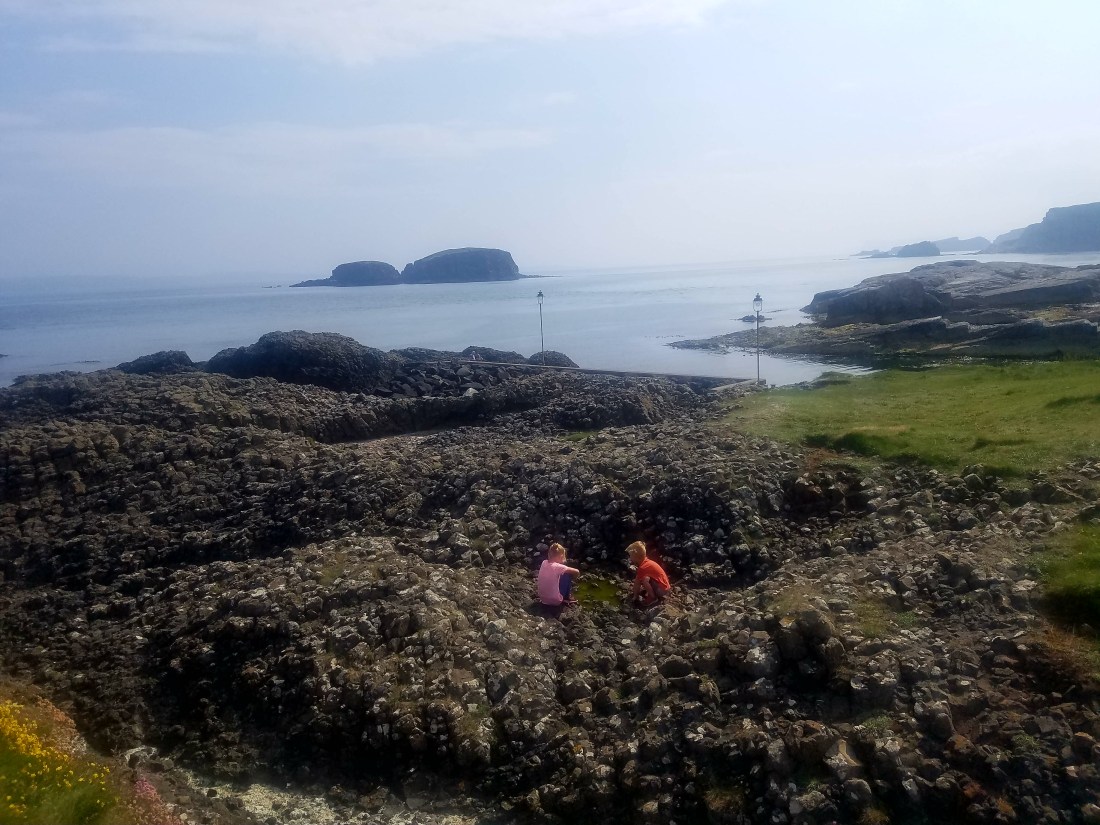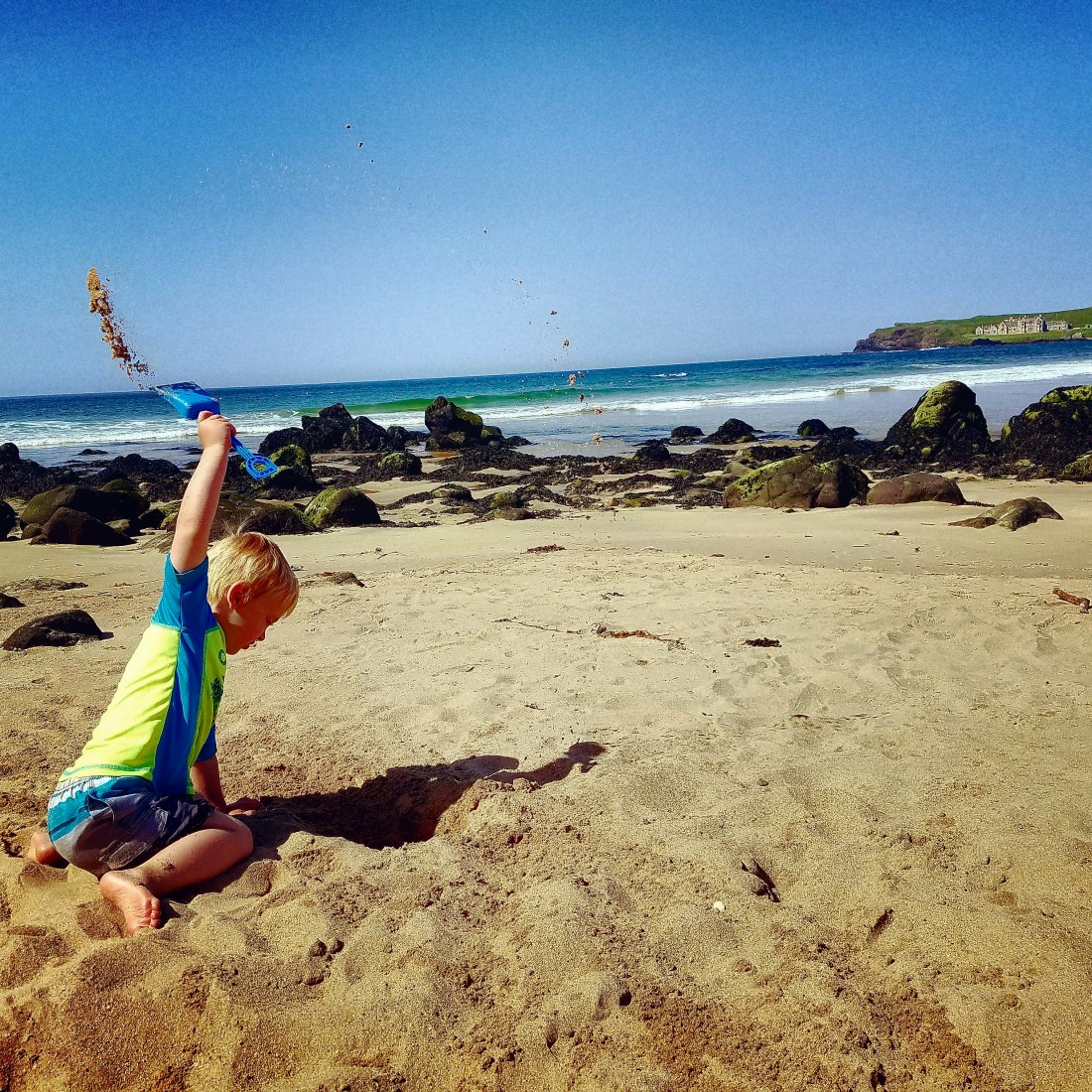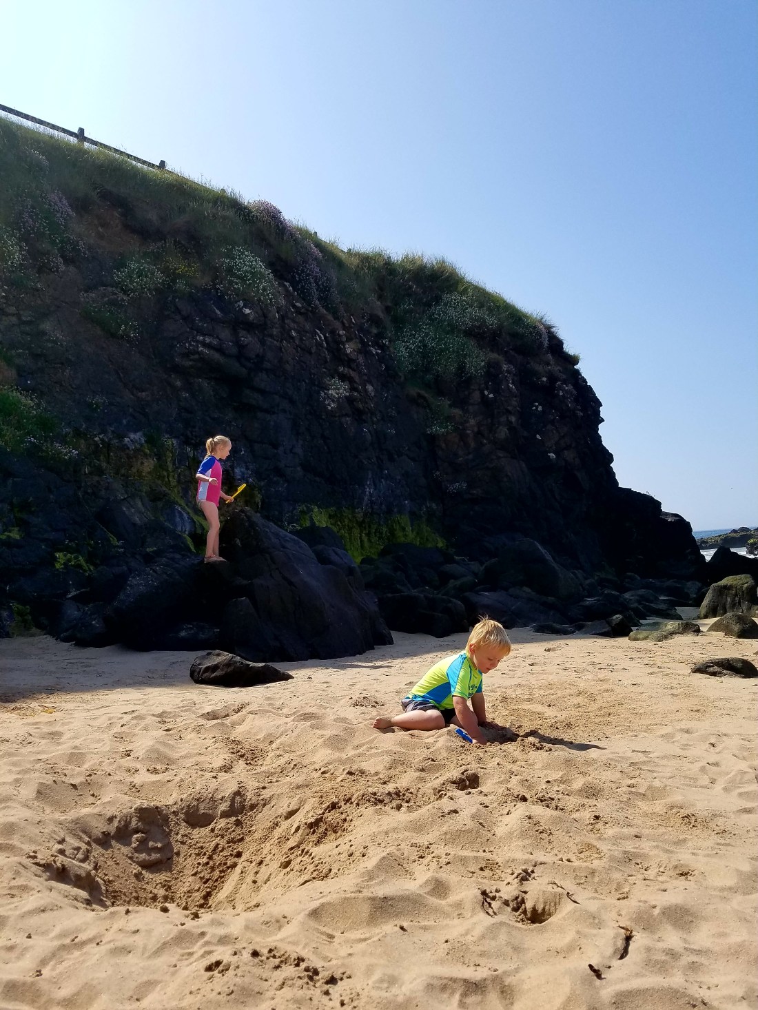 There was a lovely little sheltered beach called Sandeel Bay Beach right by our holiday home. It was evening time when we arrived and the tide was in so the beach was not accessible for us. The cousins didn’t care in the slightest as there was a sliver of sand at the top of the bay that they were able to play on. The world’s most expensive buckets and spades came in handy yet again!