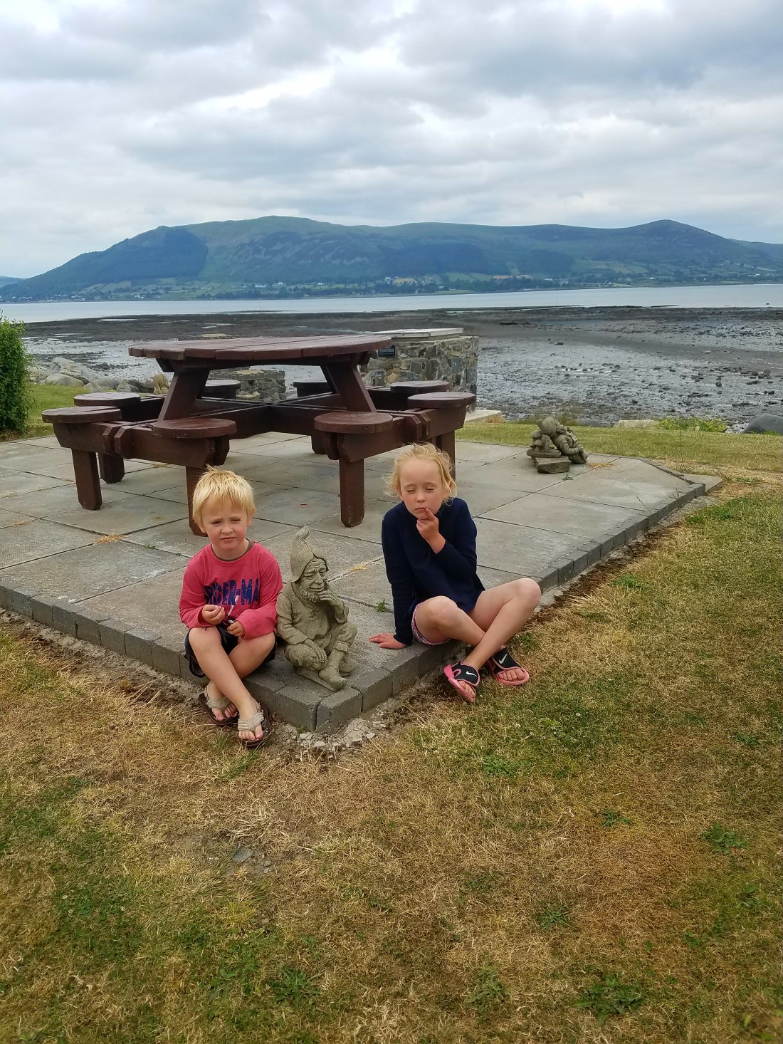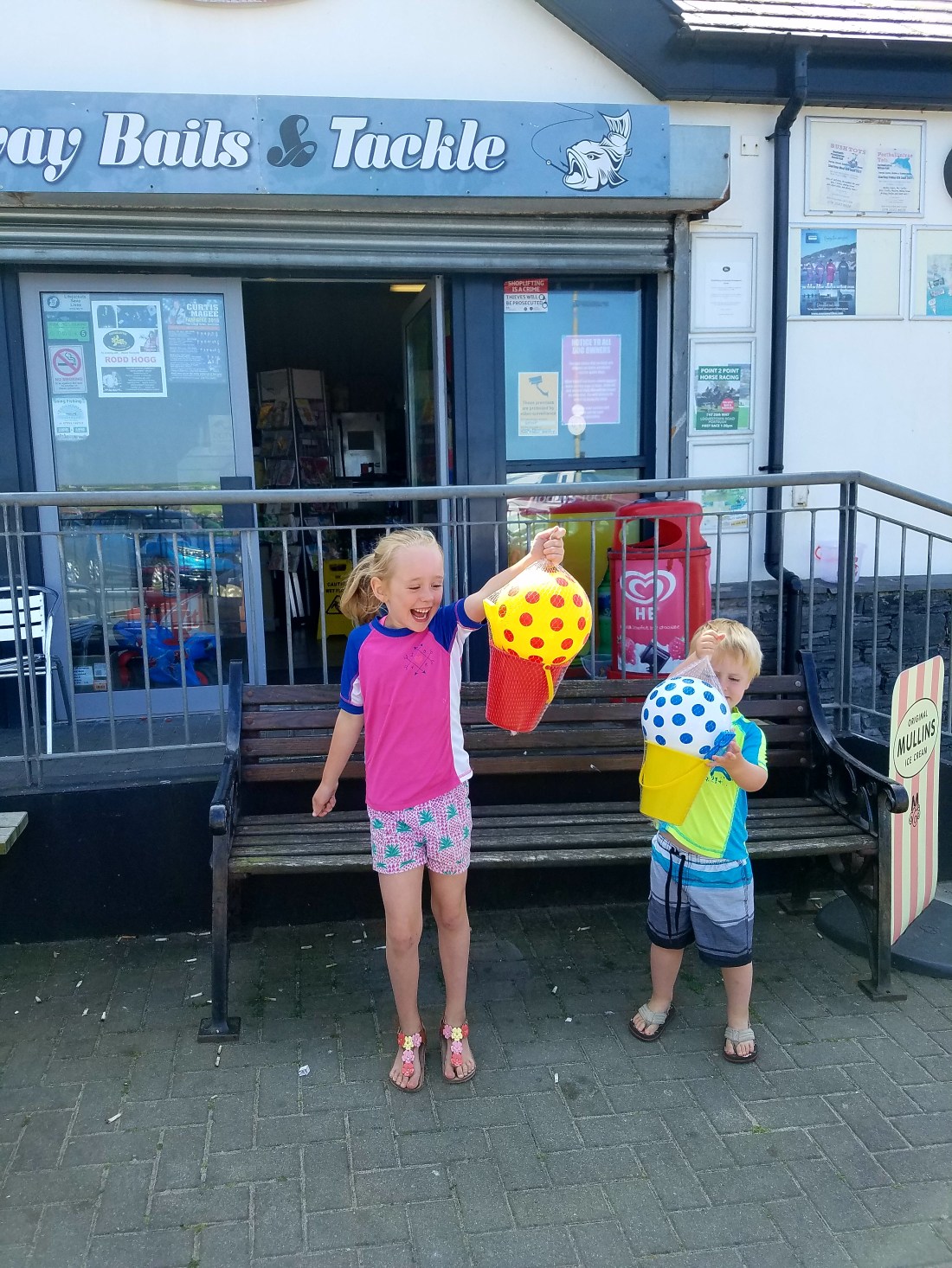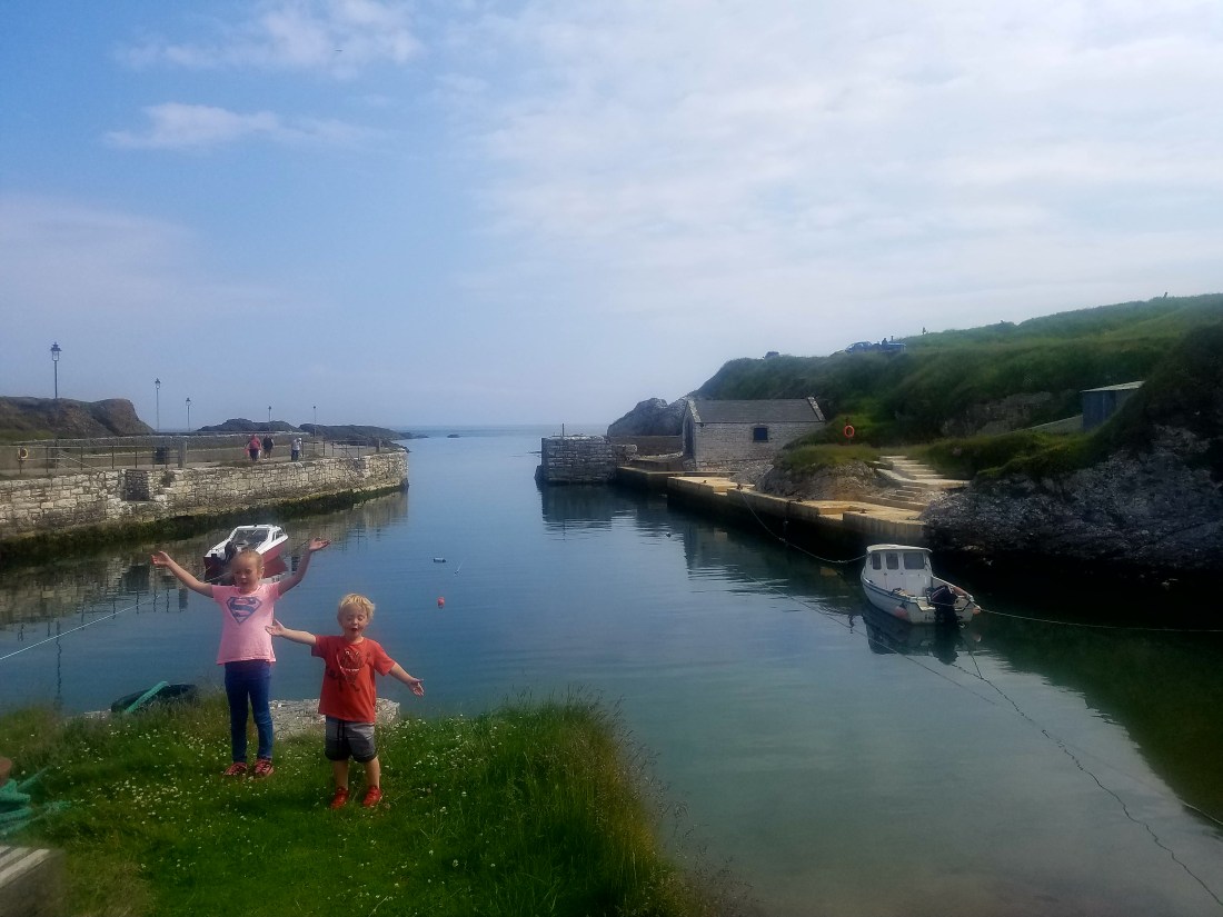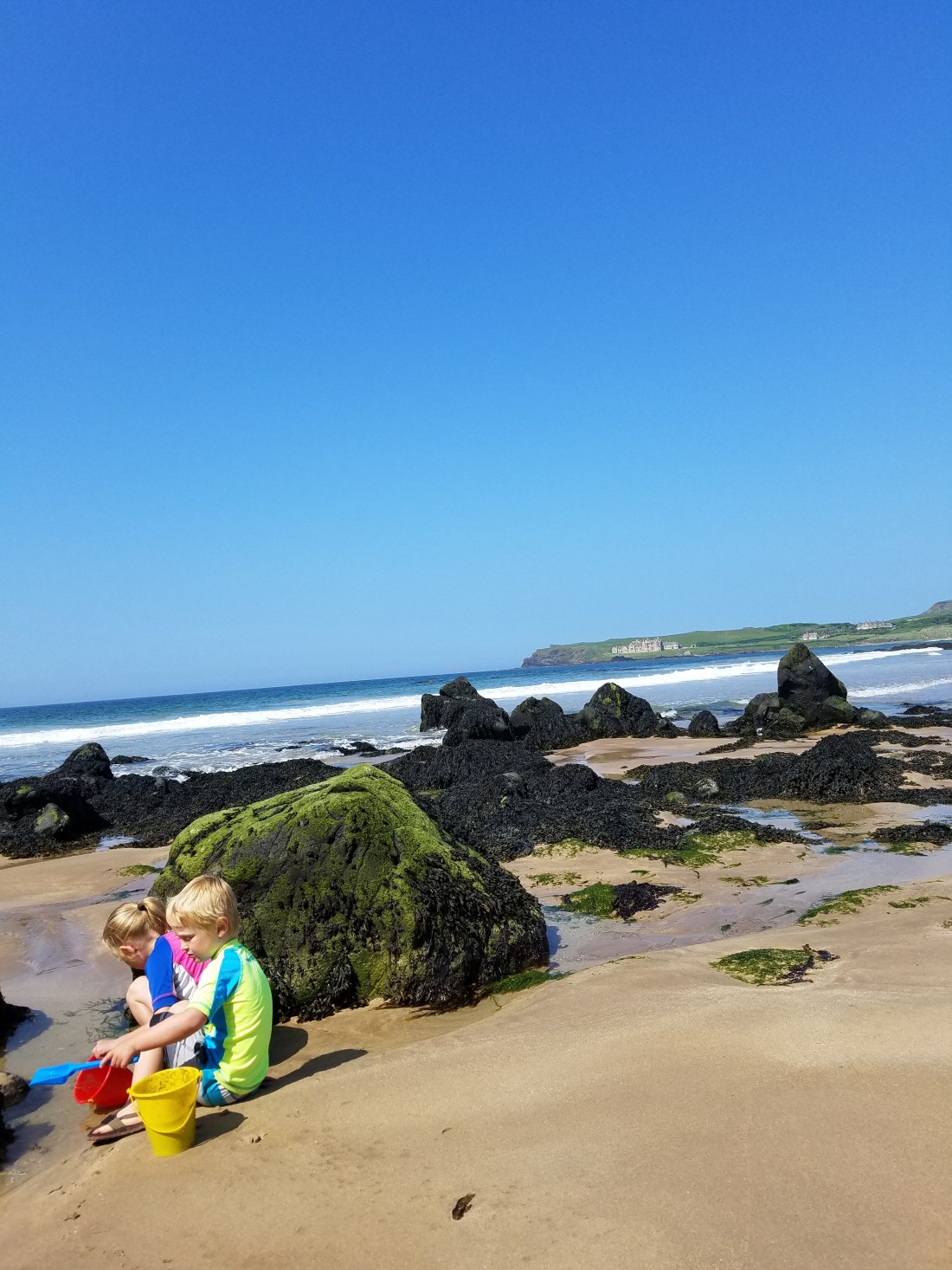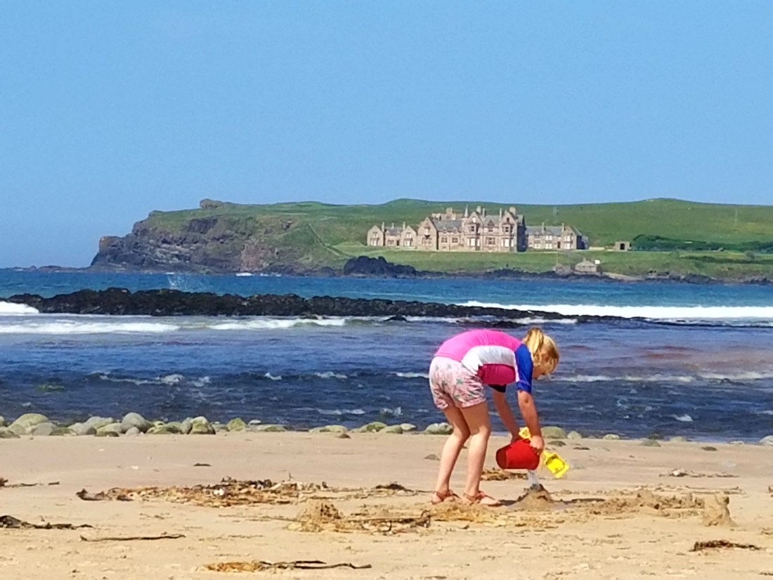There was a lovely little sheltered beach called Sandeel Bay Beach right by our holiday home. It was evening time when we arrived and the tide was in so the beach was not accessible for us. The cousins didn’t care in the slightest as there was a sliver of sand at the top of the bay that they were able to play on. The world’s most expensive buckets and spades came in handy yet again!