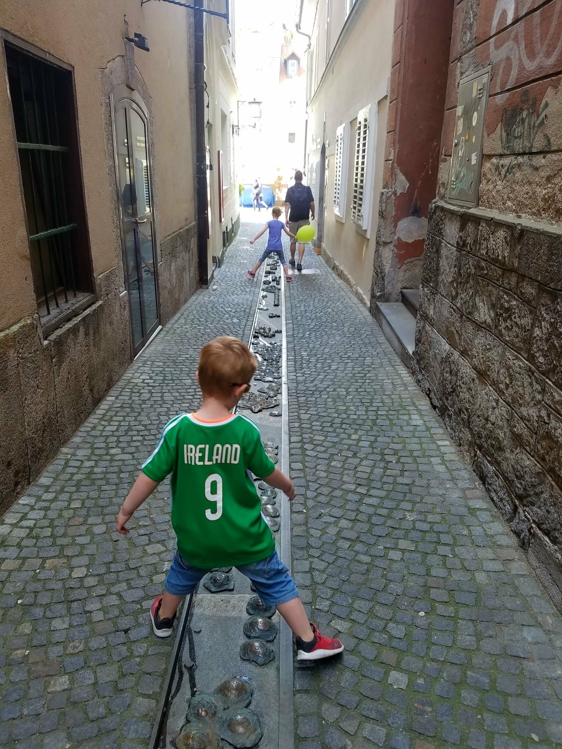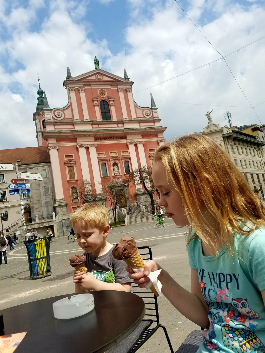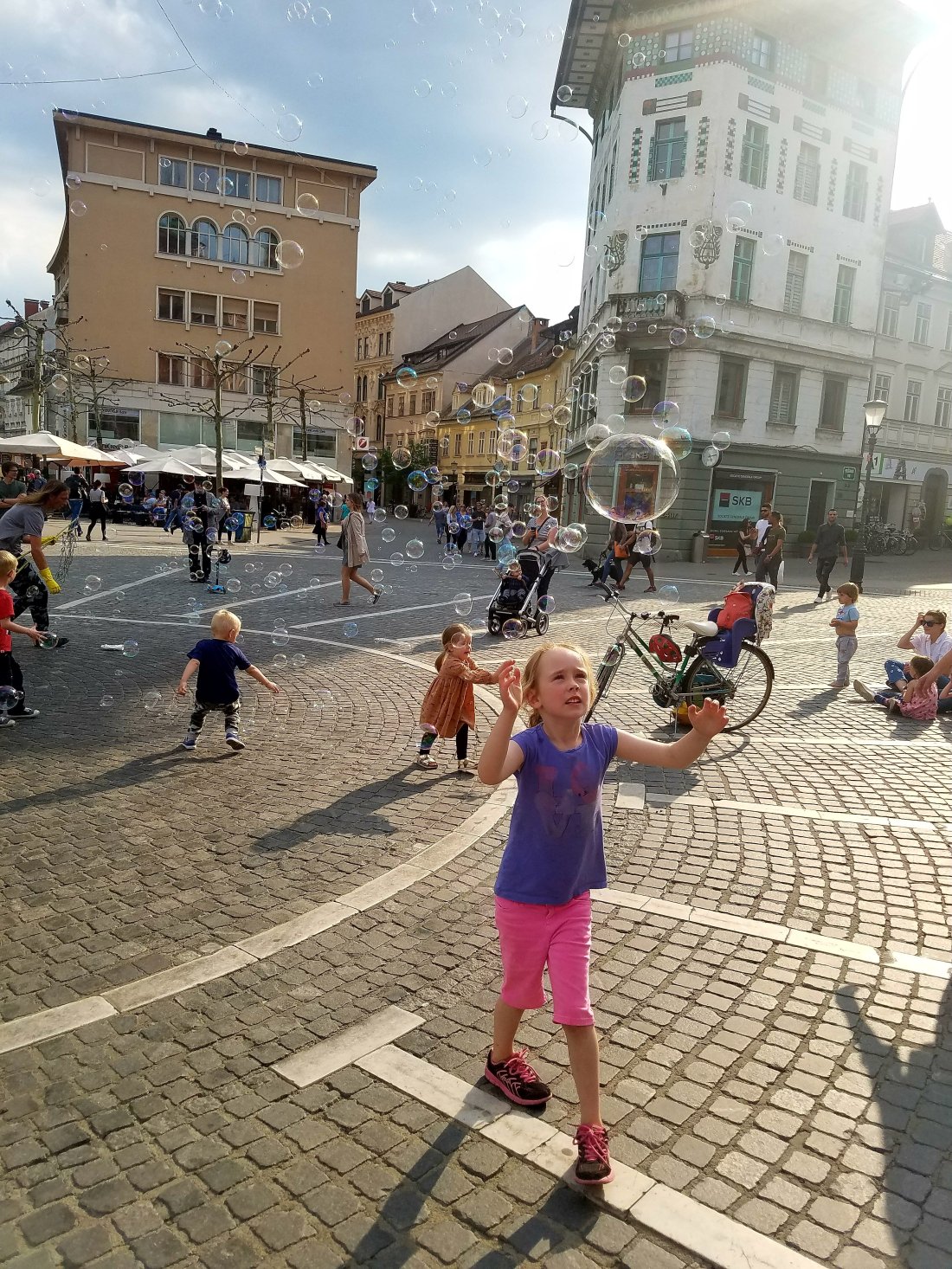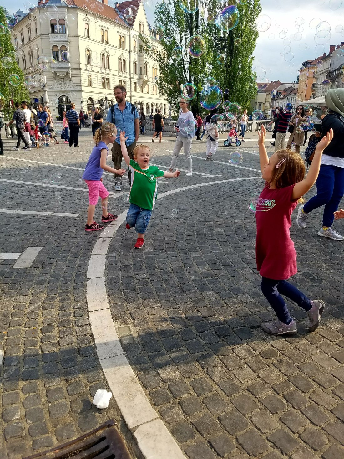 After exploring the many bridges of this Medieval city, it was time for ice cream in Preseren Square. The ice creams were devoured quickly, as there was a man in the square with a giant bubble device and the kids were dying to get in on the action.